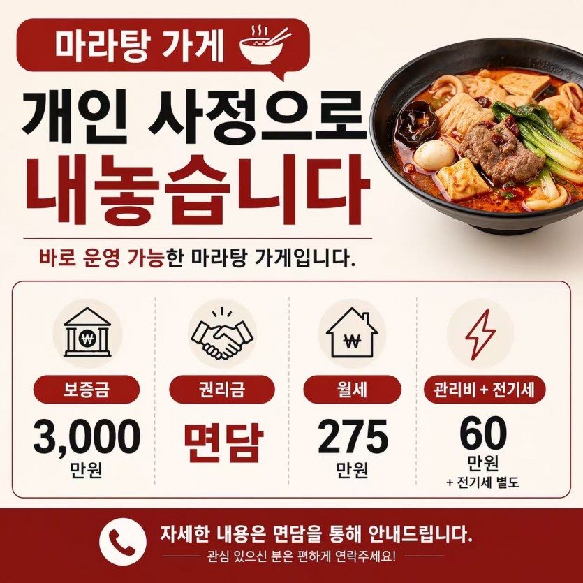 상가 분류 首尔九老麻辣烫店转让 작성자 정보 김초영쪽지보내기쪽지보내기 작성 작성일 2026.04.23 14:45 컨텐츠 정보 23 조회 본문 구로구 구로동 번화가에 위치한 2층 30평되는 마라탕 가게 白菜价에 내놓습니다. 주변에 구로구청,오피스텔촌,아파트,주택가 있습니다.단골 손님도 많고, 인테리어부터 시설까지 모두 완비!!인수후 바로 영업 가능합니다.다룬 업종도 가능합니다. 찔러보기 사양합니다.附近有九老区厅,住宅,楼房众多,回头客多设备齐全,装修豪华精致,转手直接可营业也可以做其他行业.非诚勿扰.010-2466-6111 관련자료 이전 仁川新建商住公寓 一居室 1.5亿韩元 两居室 1.8亿韩元 ㄴ三居室 2.1亿韩元 작성일 2026.04.24 08:57 다음 首尔大型中餐厅,月销售额8000万韩币,紧邻政府机关+大型公寓小区 작성일 2026.04.23 08:40 댓글 0 등록된 댓글이 없습니다. 로그인한 회원만 댓글 등록이 가능합니다. 신고 목록