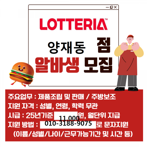 롯데리아 양재동점 오전부터 오후 근무자 구함 [파트타임 가능]