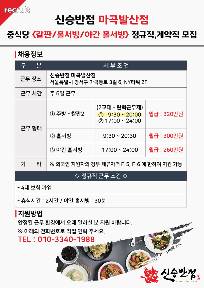 [중식당/외국인가능] 신승반점 마곡발산점 (칼판/홀서빙/야간홀서빙) 정규직, 계약직 모집
