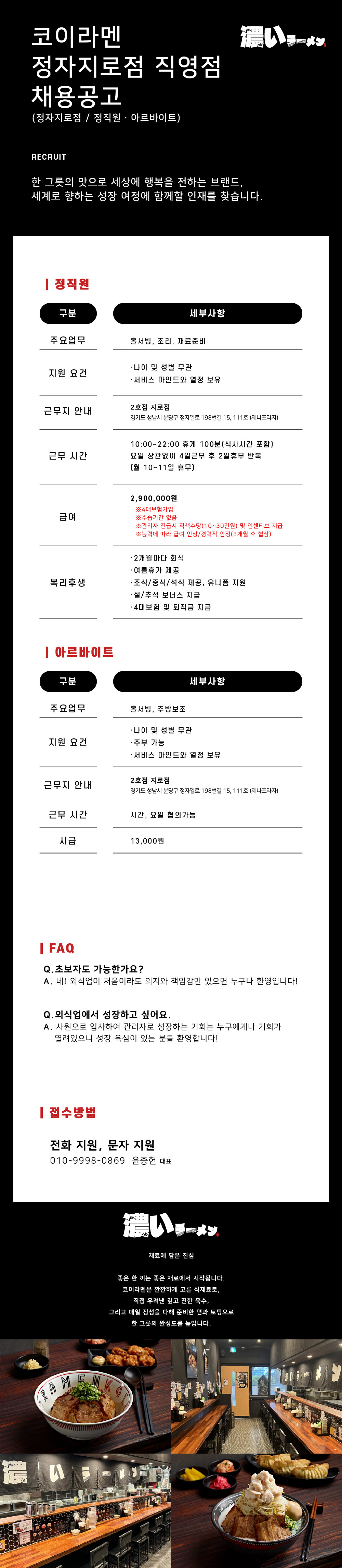 [서비스마인드/열정보유/초보/외국인가능] 주4.5일제 초봉 290만원 코이라멘 정직원 및 아르바이트 모집