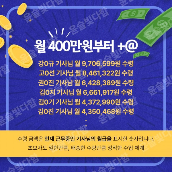 급여 조건: 월 450만원~월500만원 이상 (물량 소화량이 많아지면 +@ 급여 가능).