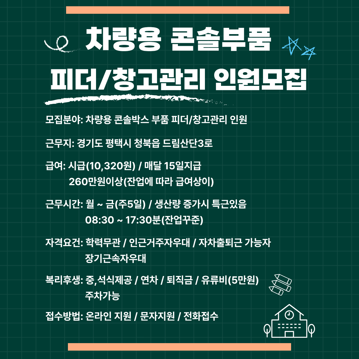 차량용 콘솔박스 부품 피더/창고관리 모집/초보 누구나가능/근무환경최상