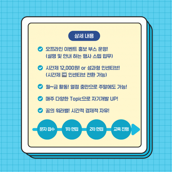 자유롭고 밝은 분위기에서 좋은 사람들과 함께 일하며, 당신의 아이디어가 빛을 발할 수 있는 기회! 지루할 틈 없이 유쾌하게 일하면서 돈도 벌고, 새로운 경험도 쌓고!