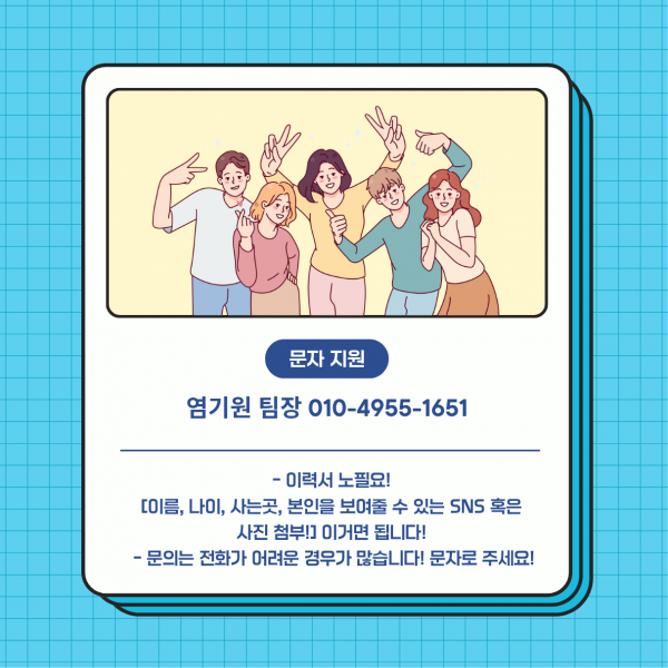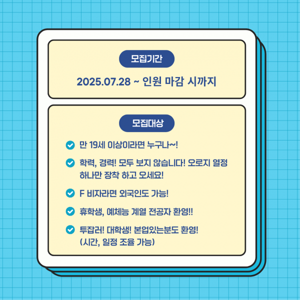 - 투잡러, 대학생, 본업이 있는 분들 모두 환영! (시간/요일 조율 가능하니 걱정 마세요!)
