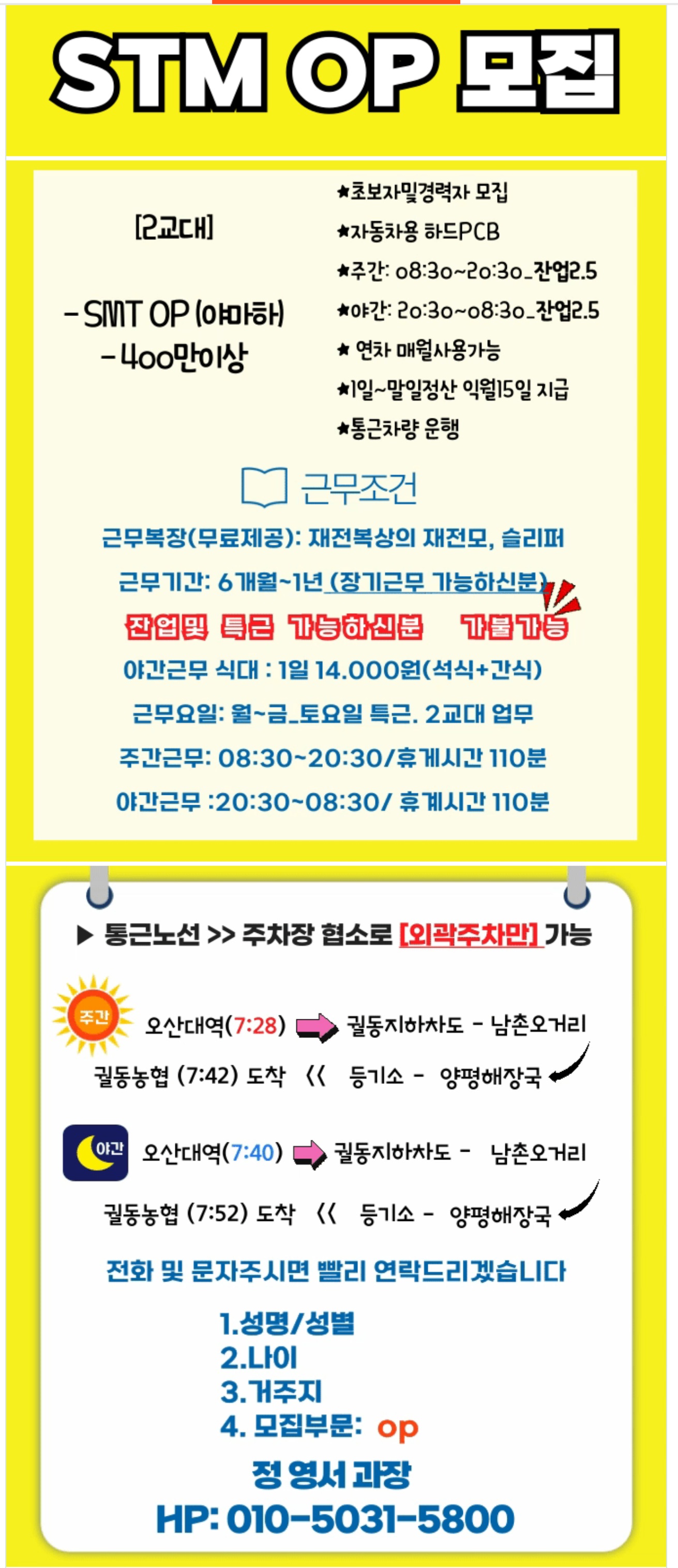 [2교대] 월400만이상 / SMTOP/ 초보자및경력자
